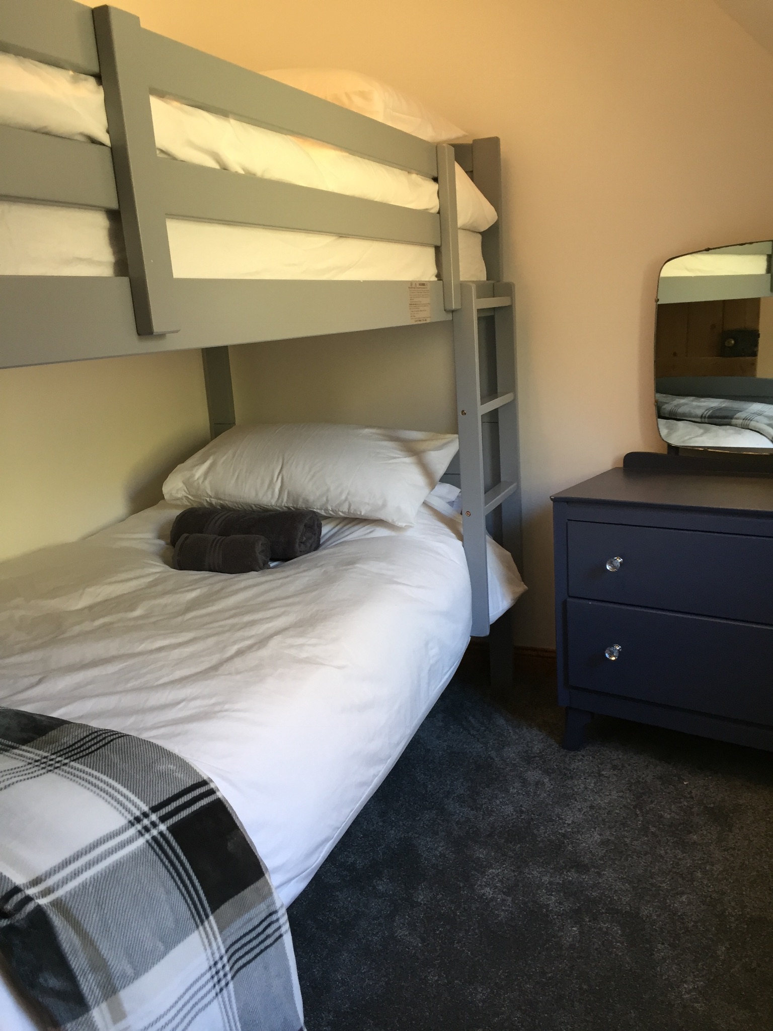 The house has two large bedrooms to the front of the house, one with king size bed and one with double bed. It also has a smaller bedroom with bunkbeds.